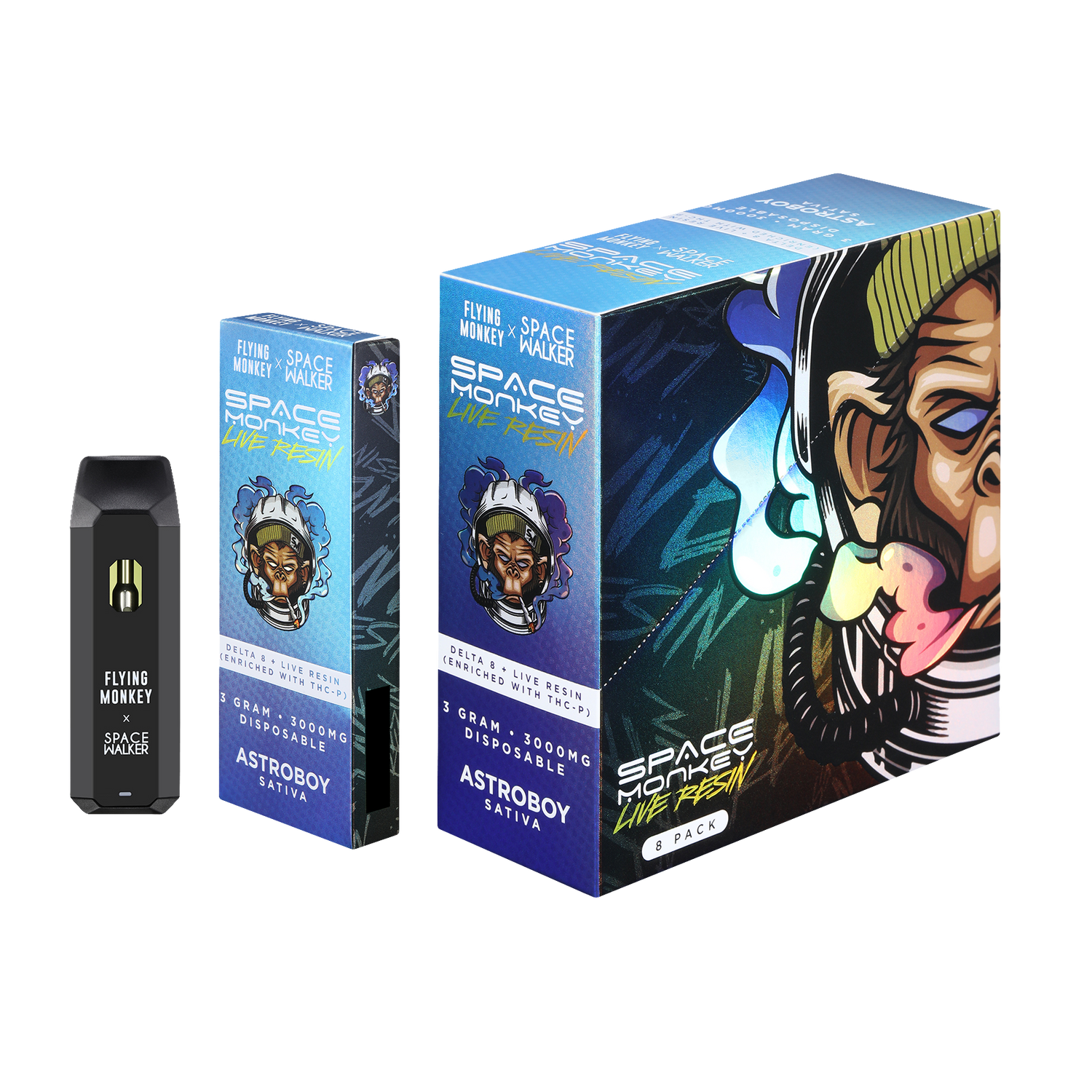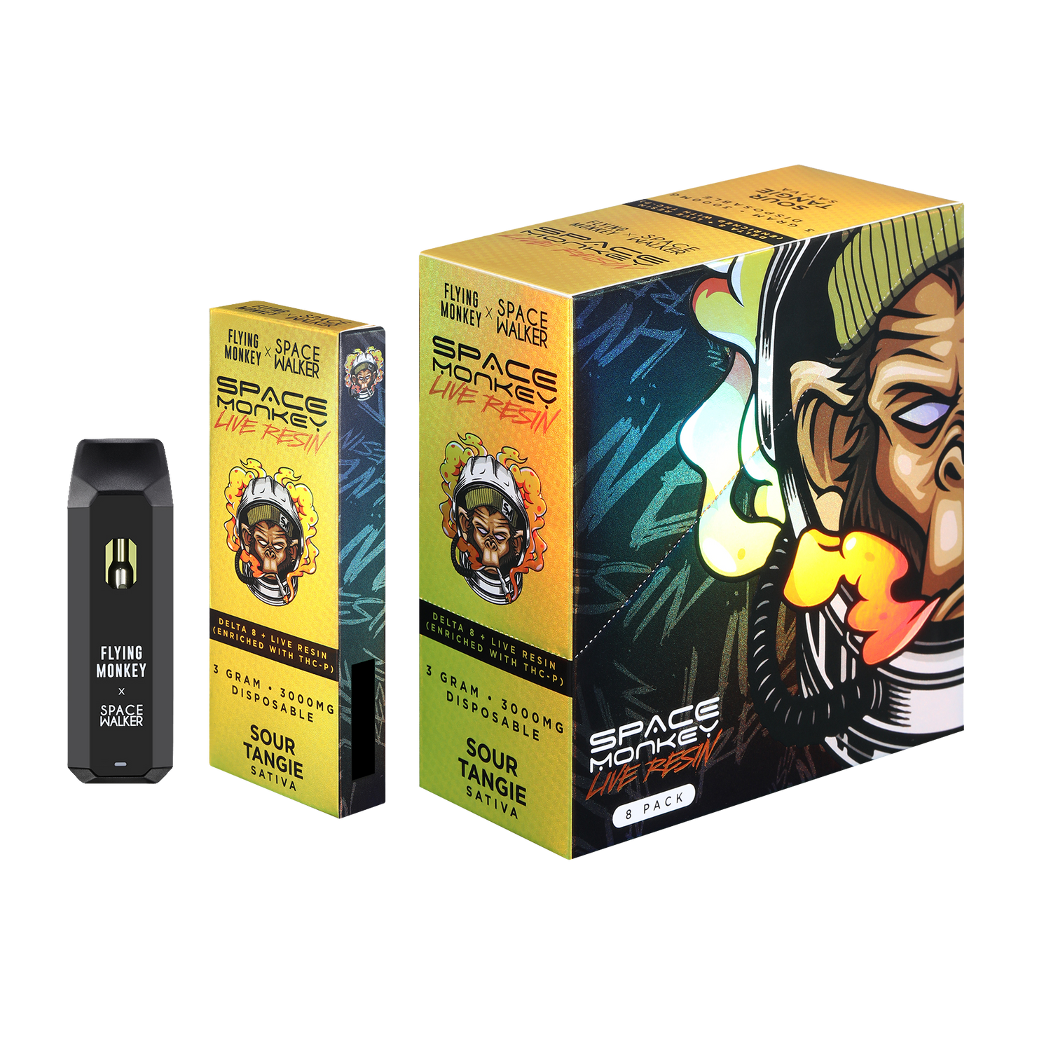 The all new SPACE MONKEY is a 3 gram device containing Delta-8 + Live Resin (Enriched with THC-P).